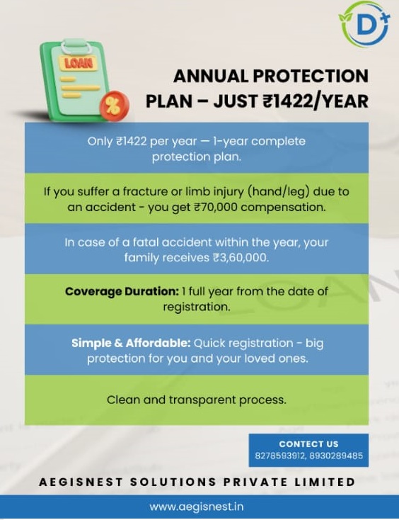 ANNUAL PROTECTION PLAN – JUST ₹1422/YEAR Only ₹1422 per year — 1-year complete protection plan. If you suffer a fracture or limb injury (hand/leg) due to an accident – you get ₹70,000 compensation. In case of a fatal accident within the year, your family receives ₹3,60,000. Coverage Duration: 1 full year from the date of registration. Simple & Affordable: Quick registration – big protection for you and your loved ones. Clean and transparent process. CONTACT US 8278593912, 8930289485 AEGISNEST SOLUTIONS PRIVATE LIMITED www.aegisnest.in
