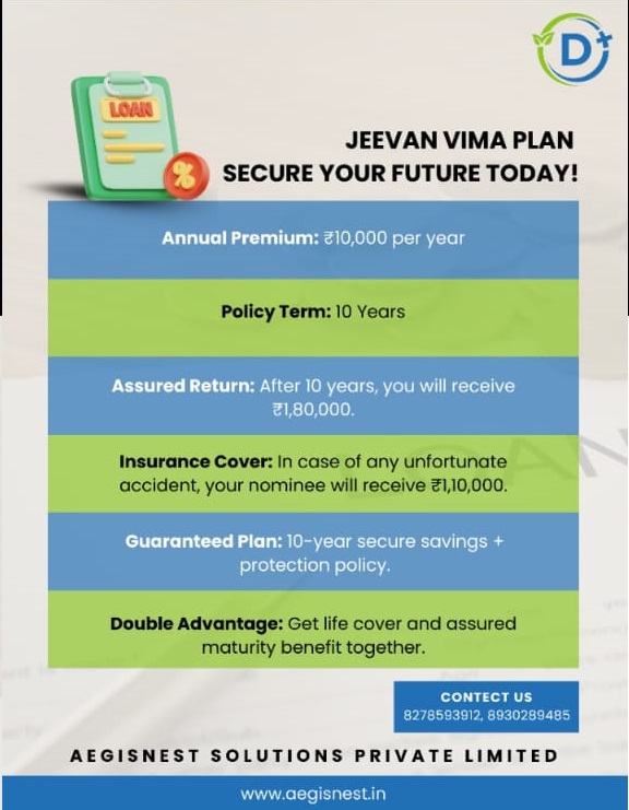 JEEVAN VIMA PLAN SECURE YOUR FUTURE TODAY! Annual Premium: ₹10,000 per year Policy Term: 10 Years Assured Return: After 10 years, you will receive ₹1,80,000. Insurance Cover: In case of any unfortunate accident, your nominee will receive ₹1,10,000. Guaranteed Plan: 10-year secure savings + protection policy. Double Advantage: Get life cover and assured maturity benefit together. CONTACT US 8278593912, 8930289485 AEGISNEST SOLUTIONS PRIVATE LIMITED www.aegisnest.in