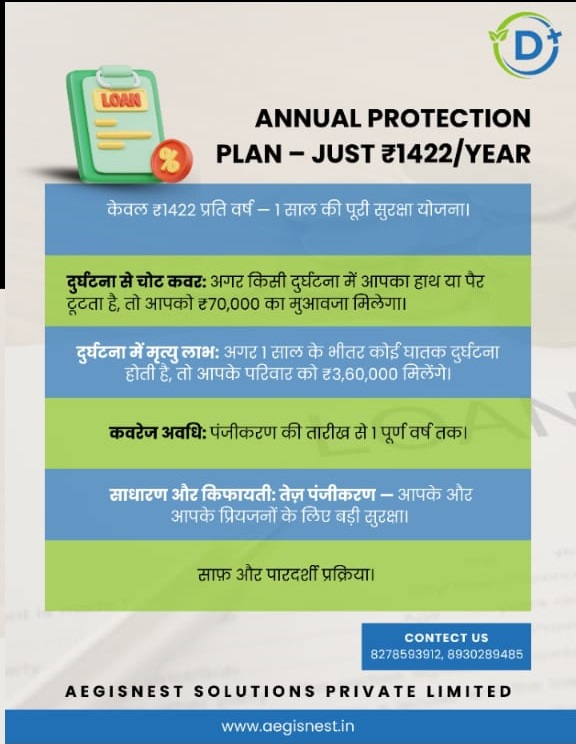 ANNUAL PROTECTION PLAN – JUST ₹1422/YEAR केवल ₹1422 प्रति वर्ष – 1 साल की पूरी सुरक्षा योजना। दुर्घटना से चोट कवच: अगर किसी दुर्घटना में आपका हाथ या पैर टूटता है, तो आपको ₹70,000 का मुआवज़ा मिलेगा। दुर्घटना में मृत्यु लाभ: अगर 1 साल के भीतर कोई घातक दुर्घटना होती है, तो आपके परिवार को ₹3,60,000 मिलेंगे। कवरेज अवधि: पंजीकरण की तारीख से 1 पूर्ण वर्ष तक। साधारण और किफायती: त्वरित पंजीकरण – आपके और आपके प्रियजनों के लिए बड़ी सुरक्षा। साफ और पारदर्शी प्रक्रिया। CONTACT US 8278593912, 8930289485 AEGISNEST SOLUTIONS PRIVATE LIMITED www.aegisnest.in